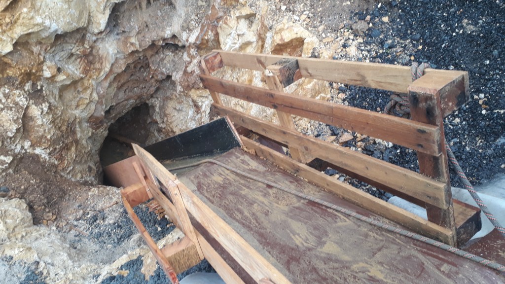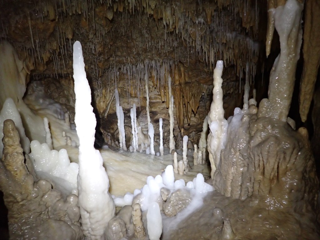 Après trois semaines de désobstruction intense, nous avons réussi à passer dans un boyau semi vertical assez étroit qui nous a permis d’accéder au balcon d’une salle: porte d’entrée de ce réseau que nous nommons prosaïquement le trou du lampadaire.