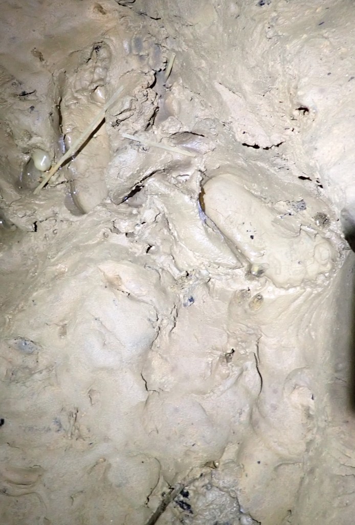 En prenant beaucoup de précaution, nous continuons l’exploration : nous posons au sol des rubalises que nous suivrons afin de de pas piétiner des vestiges. La suite va nous faire monter les larmes au yeux car dans la glaise, nous découvrons des traces de pieds nus d’enfants ! Aussi quand après de belles concrétions triangulaires, nous voyons une corne (de chèvre), dans l’état d’émerveillement qui est le nôtre, nous décidons de rebaptiser la cavité : le trou de la licorne!